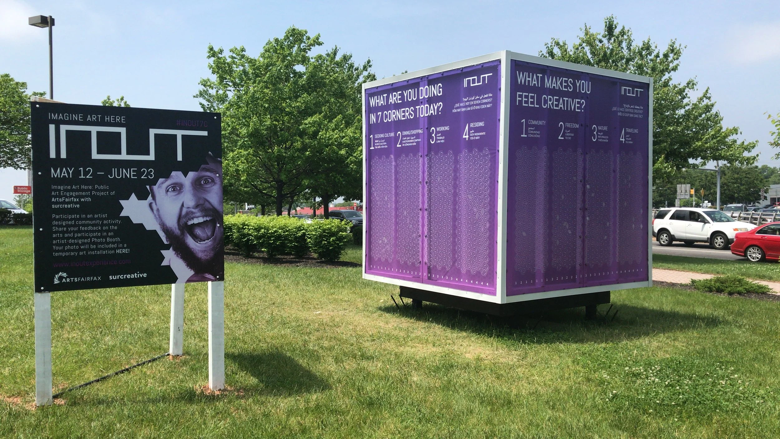 INOUT was an interactive, public art installation designed by surcreative—including the digital, environmental and print graphics—with a group of architects and artists (named “Epigram Studio”) to engage the Seven Corners, Virginia community with a larger-than-life, public photo booth experience! The outdoor art exhibition illuminated the night with community portraits projected on an eight-foot cube that was powered by solar panels.